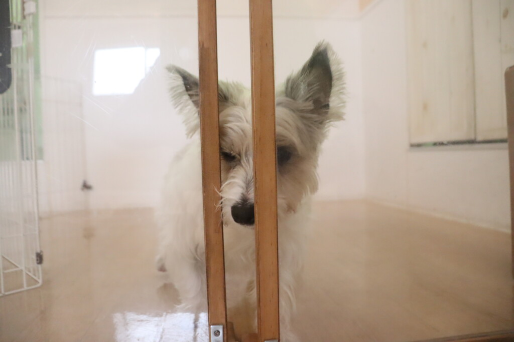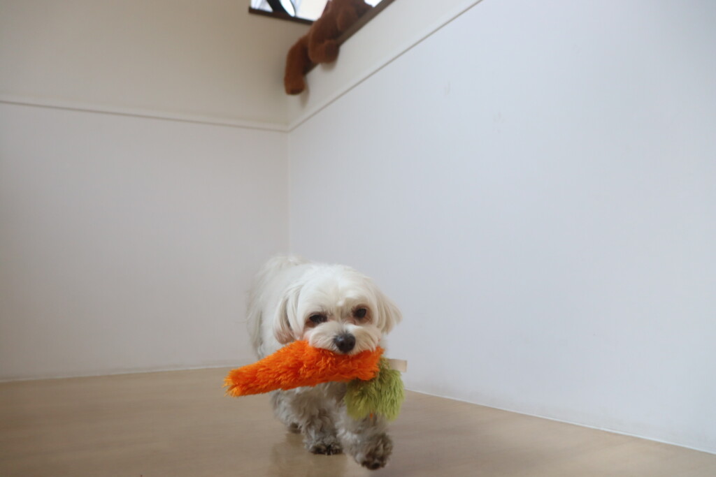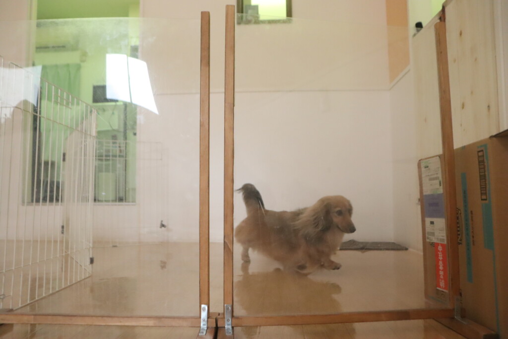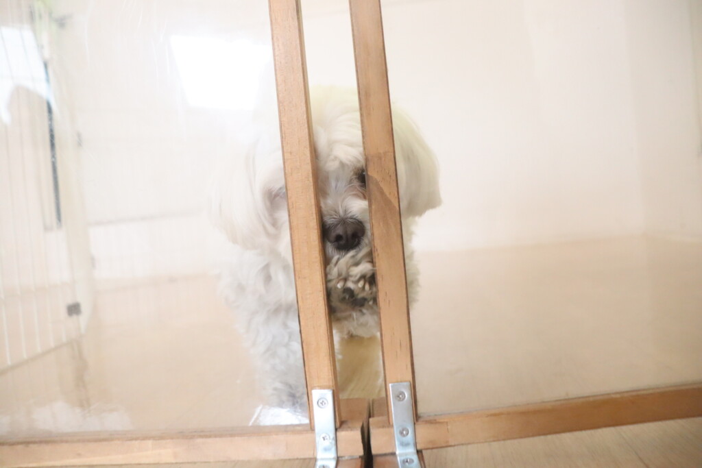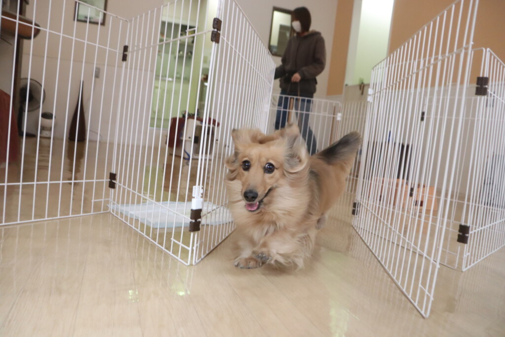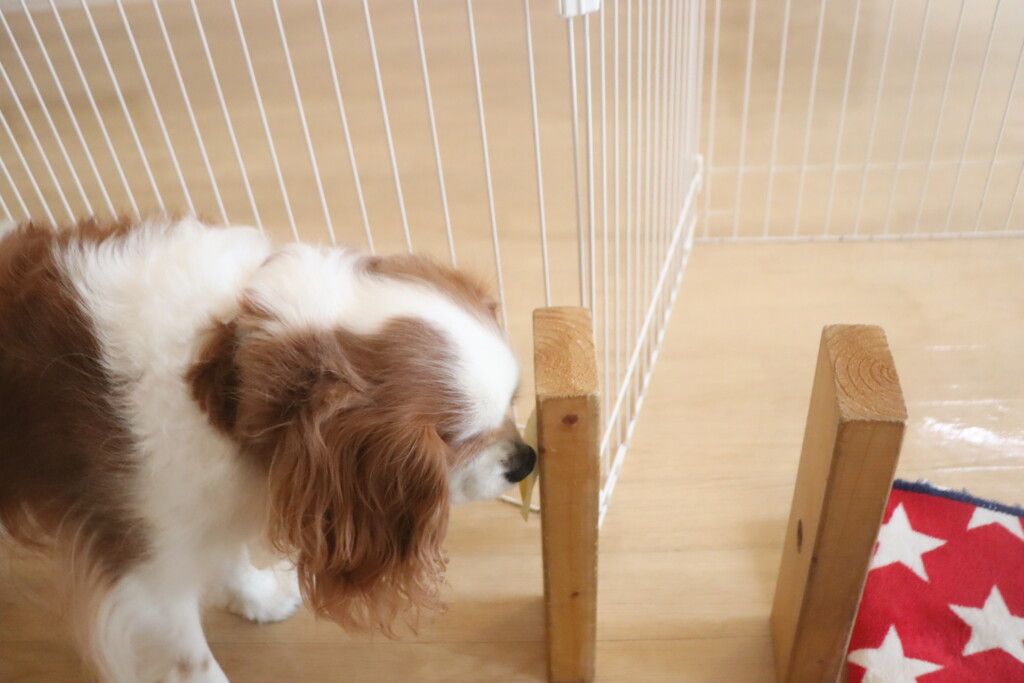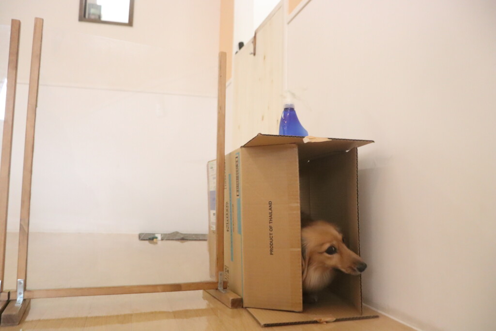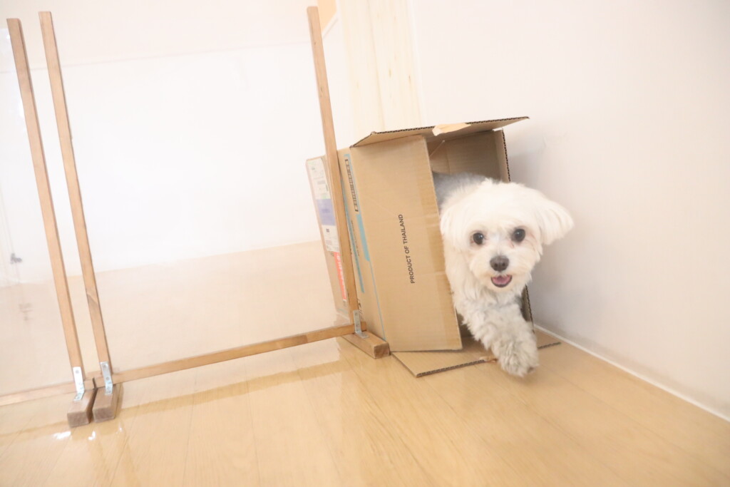 ラテちゃんはパーテーションとダンボールで作った脱出ゲームに挑戦しました!苦戦するかと思いきや、一目散に出口の方へ‼💨