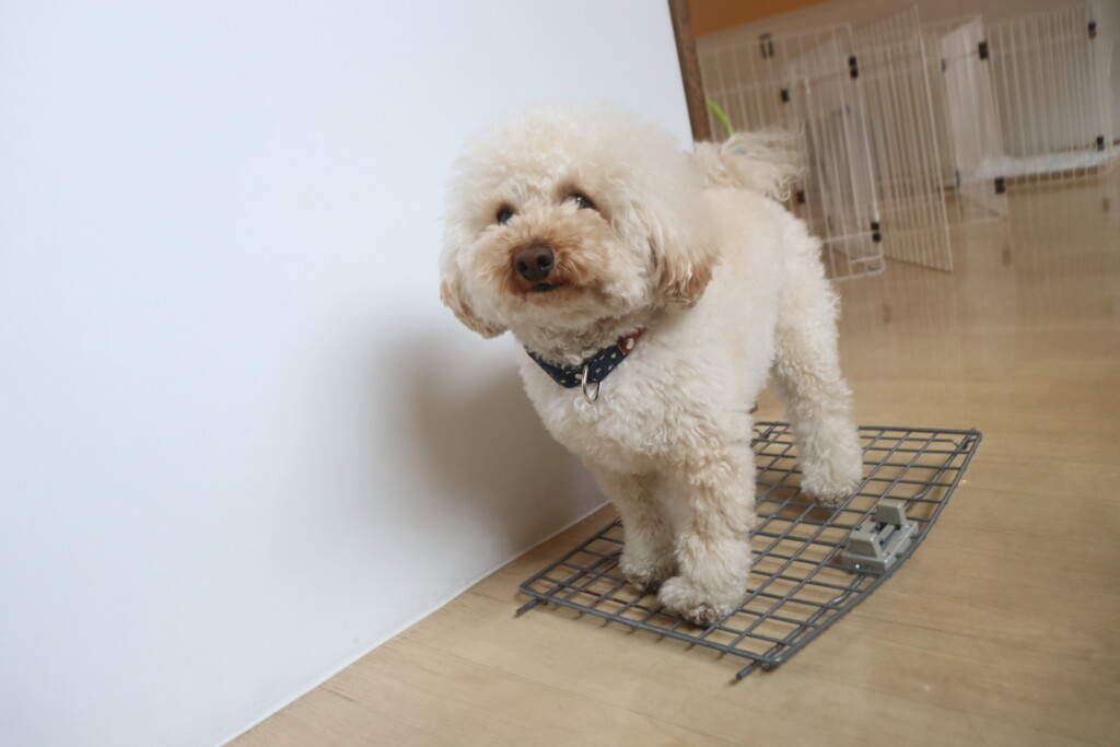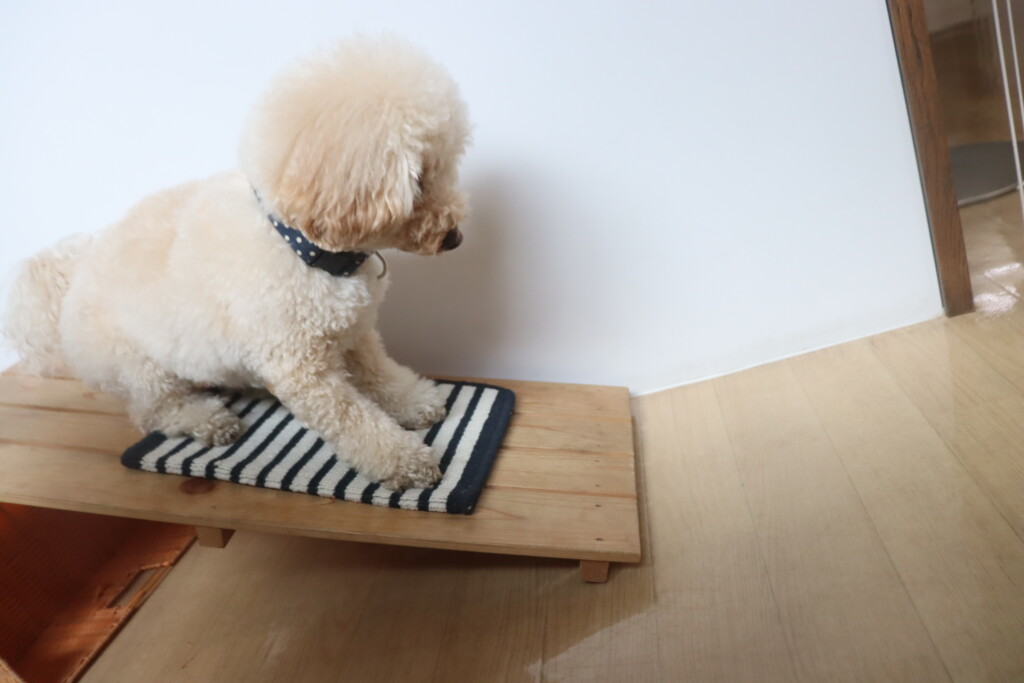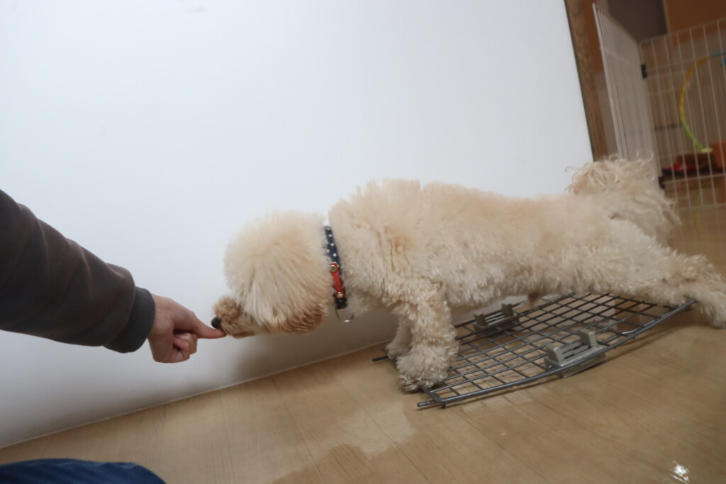 晴くんは、クレートの扉で足場慣れを行いました!後ろ足は絶対に乗せたくないのか、限界まで後ろ足を伸ばす晴くん🤭