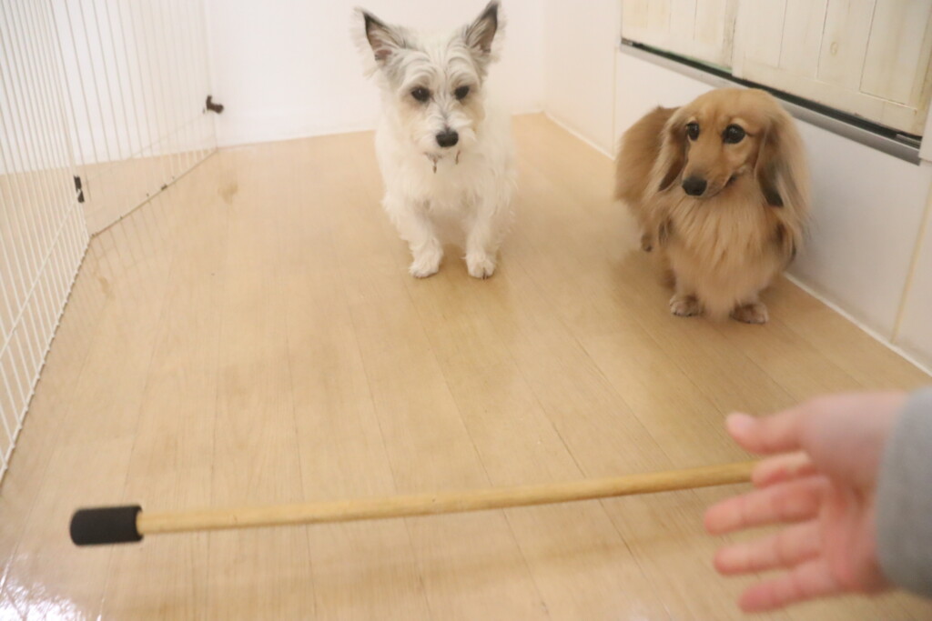 ソフィちゃんと一緒に棒を使って物慣れを行いました!スタッフが二頭に向けて棒を転がすと…