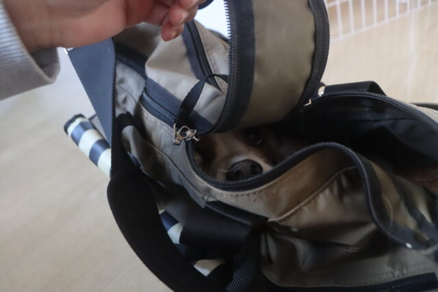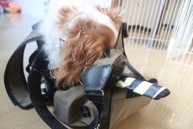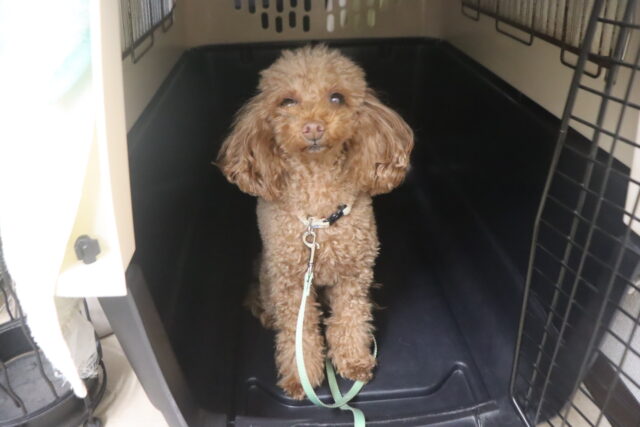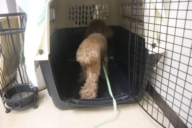 いつもくうちゃんが入っているものの数倍大きなクレートですが、「ハウス!」と指示すると意外にもすんなり中へ!!