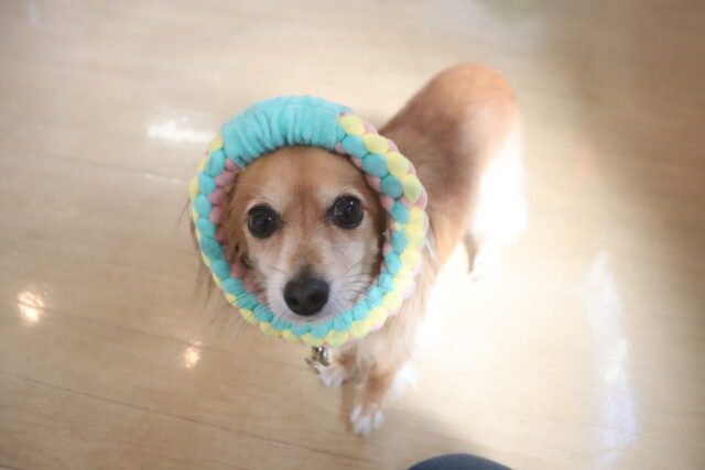 頭にかけてみたりとスタッフに遊ばれていましたが、モモくんもなんだか気に入ってるようです( *´艸`)