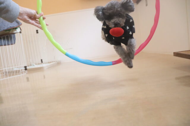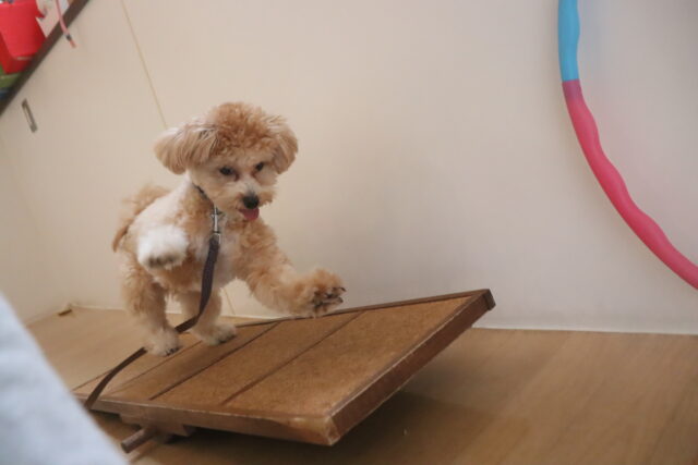 アンディくんはシーソーやフラフープを使って、足場慣れや物慣れをしています!