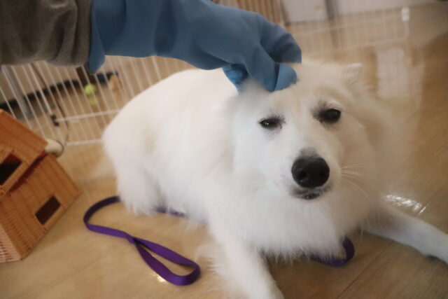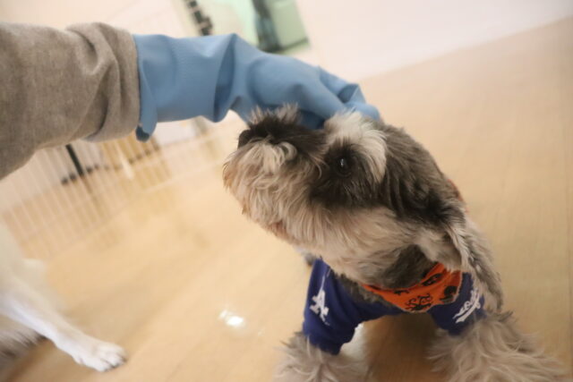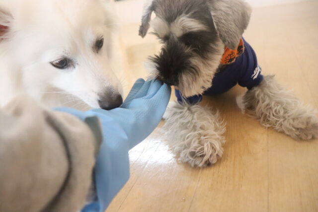 スタッフがゴム手袋をつけた状態で体や頭を触ると2頭とも少し気にしており、苦手そうでした💦