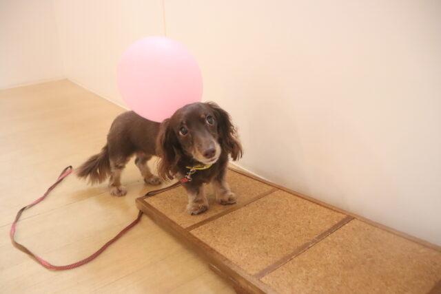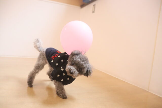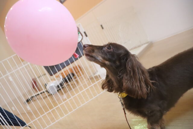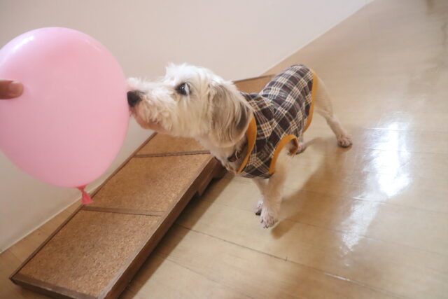 首輪に風船を巻き付けてみると、「なんだぁ!?」と戸惑うミーシャちゃん(笑)