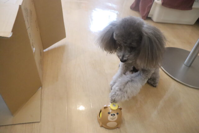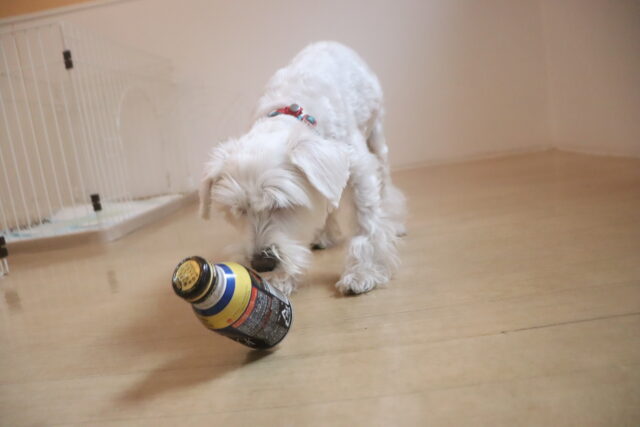 いつものペットボトルと違い、なかなか前足で倒すことが出来なかったソランちゃんは…