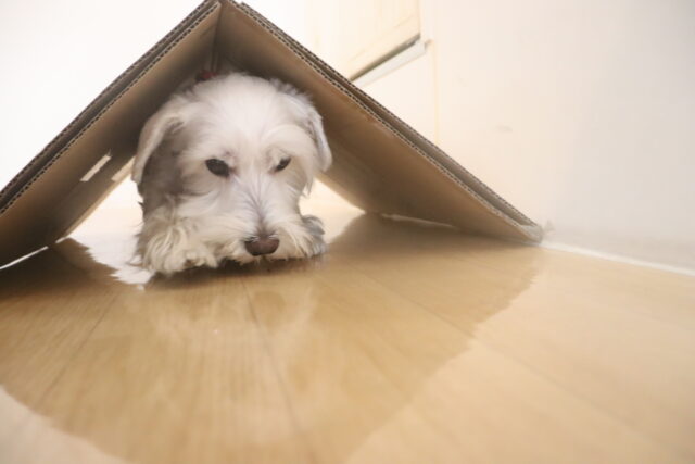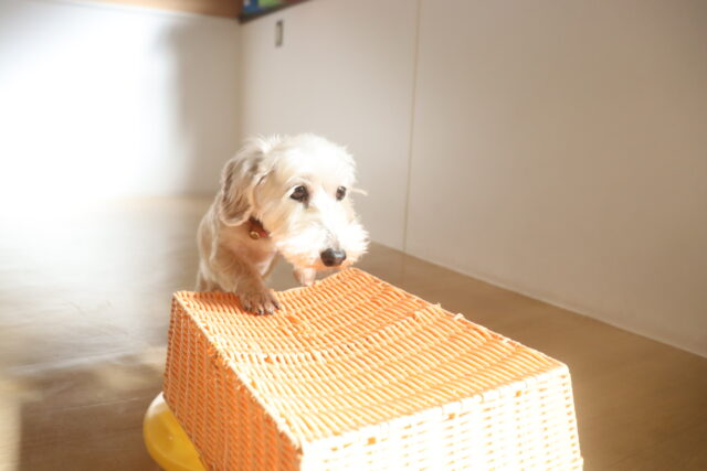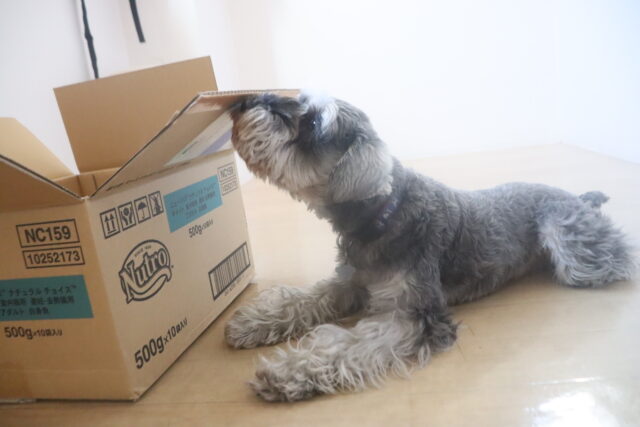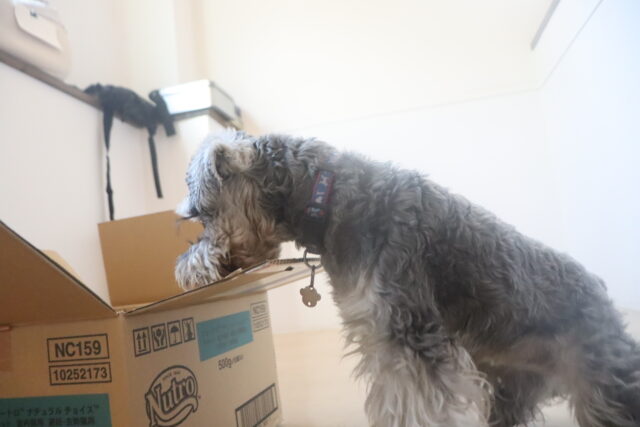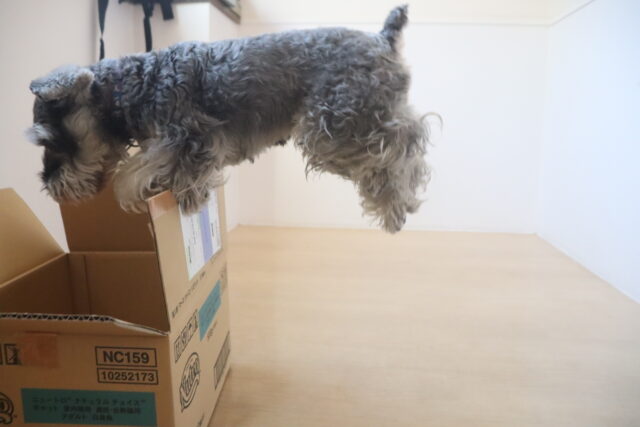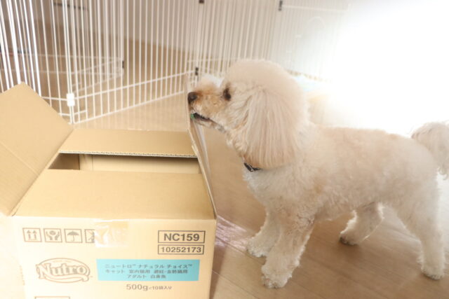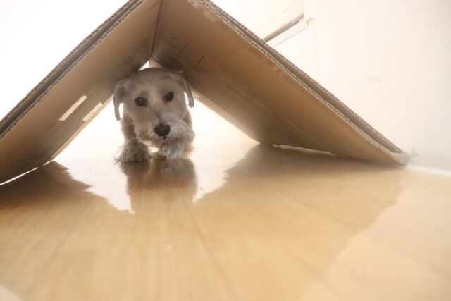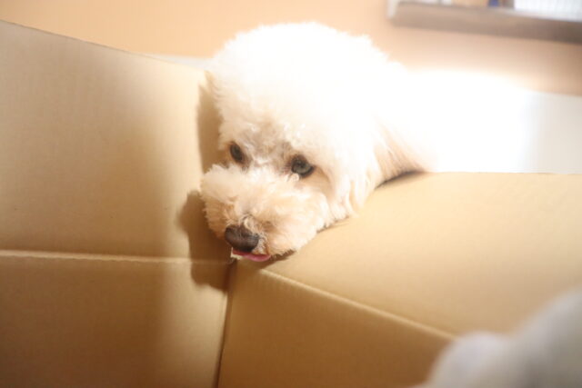 ポチちゃんもダンボールを閉めるトリックに挑戦しています!