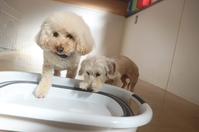 バスタブの端を持ち上げ高さを出すと一瞬ビックリする小梅ちゃんと、そんなことでは動じない晴くん😎