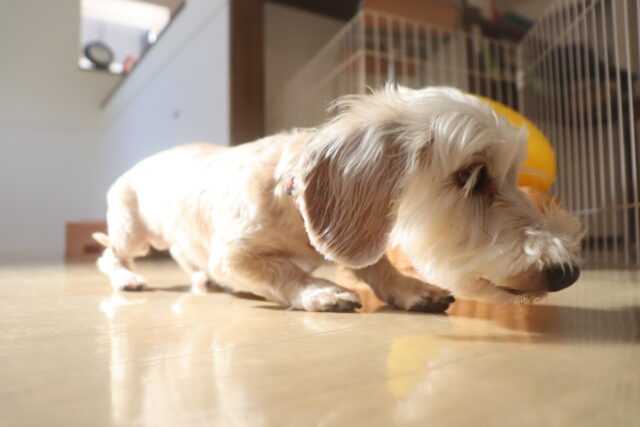 後ろ足の筋力アップトレーニングのおかげか、少しほふく前進にも進歩が!!