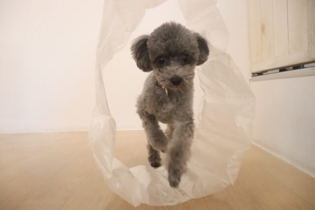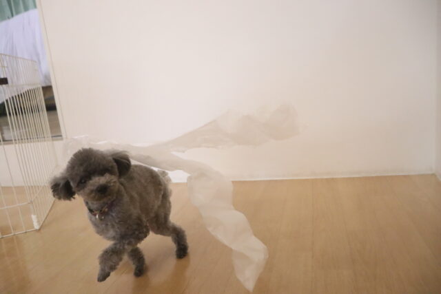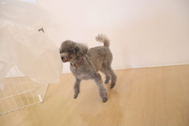 ビニールの梱包材慣れではバサバサと遠慮なく振り回すスタッフに少し迷惑そうなモモちゃん…😅