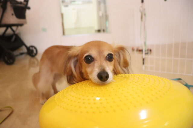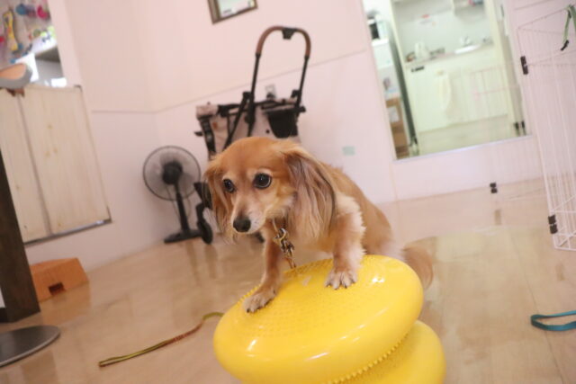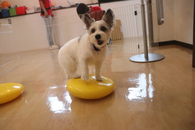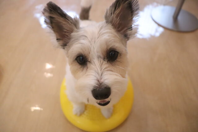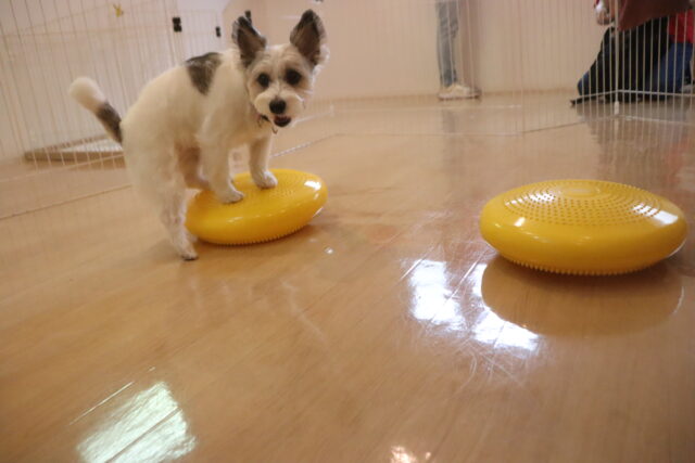 2つ重ねたディスクはいつもより揺れるのでらいくんも困惑気味でしたが、何とか前足を乗せた状態をキープ出来たね👏