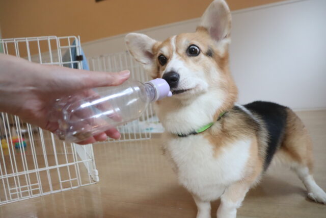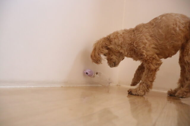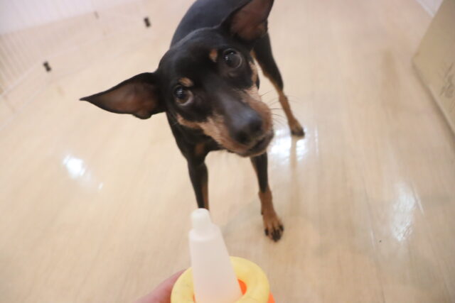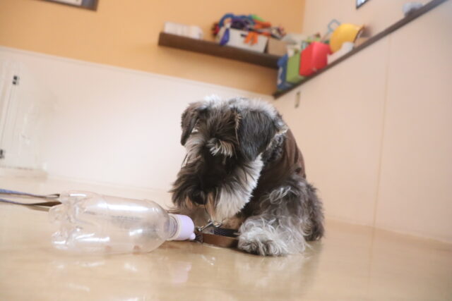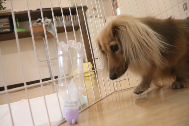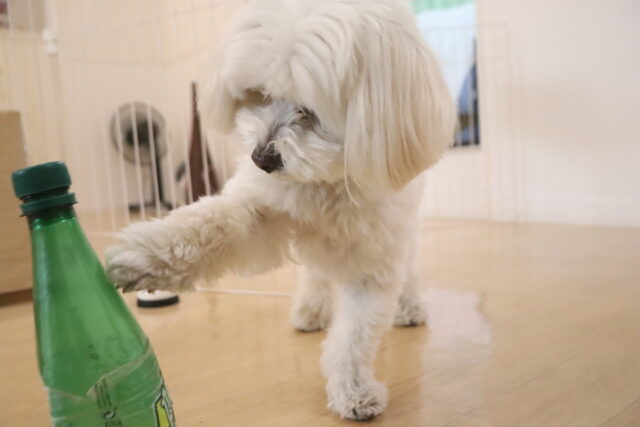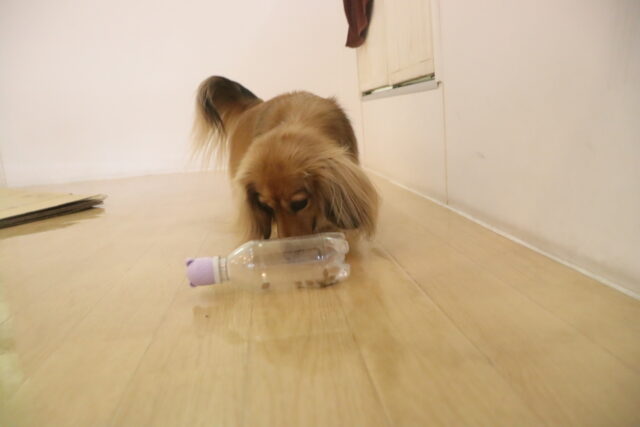 サクラちゃんもペットボトルの知育玩具で遊びました!初めはペットボトルにビックリしていましたが…