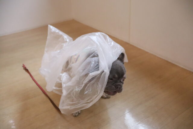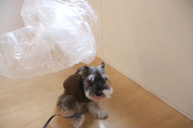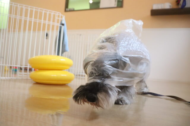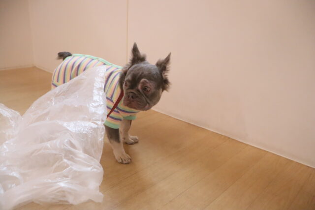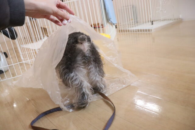 クオンくんはビニール袋で物慣れを行いました!上からのビニール袋にビックリなクオンくん( ゚Д゚)