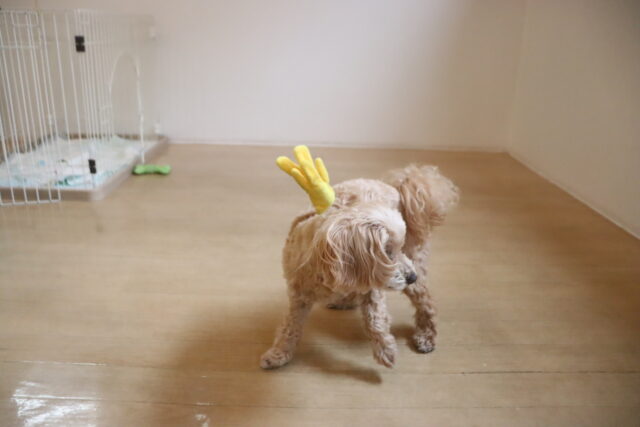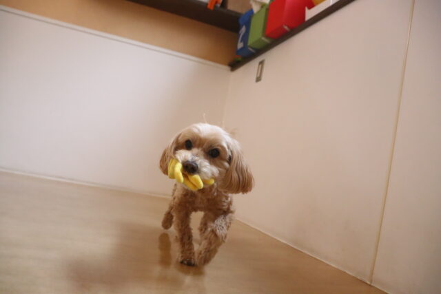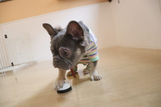 ラテちゃんは知育玩具で遊びました!フードに夢中な様子👀