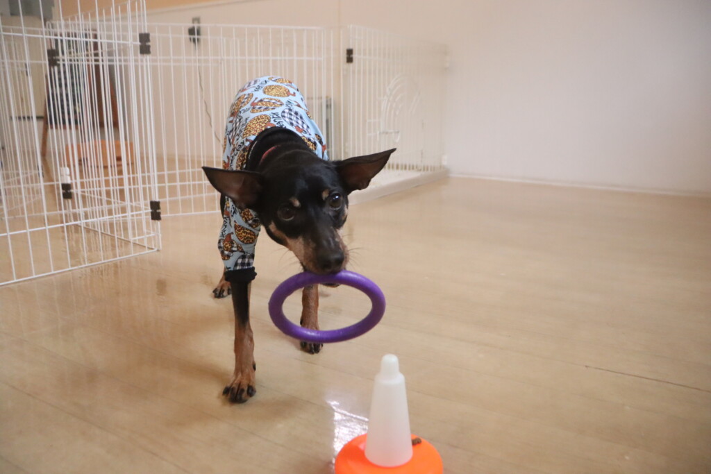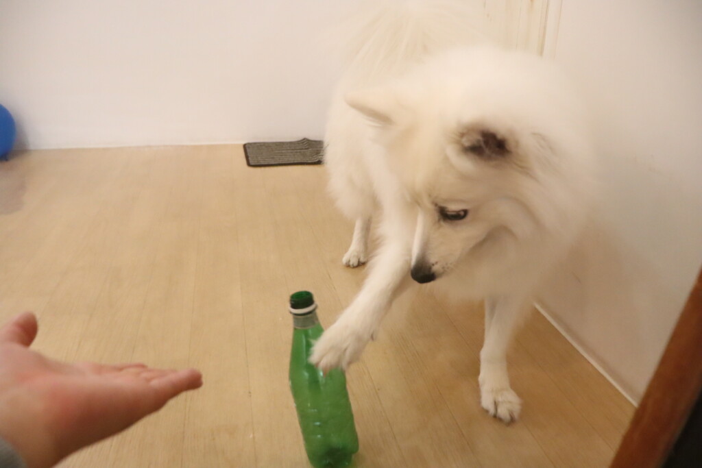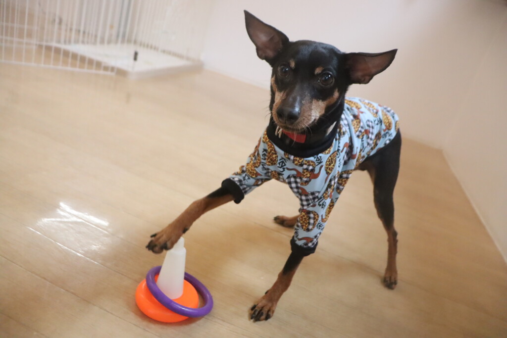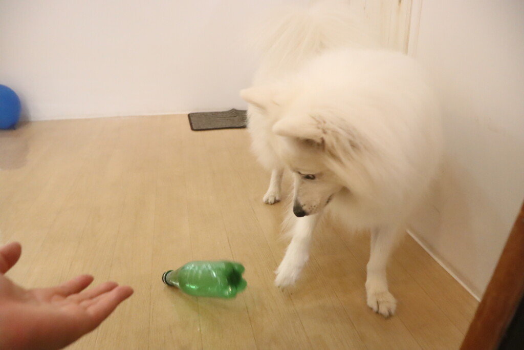 大好きなオモチャを使ったマテの練習ではついつい目が泳いでしまうサクラちゃん…(笑)