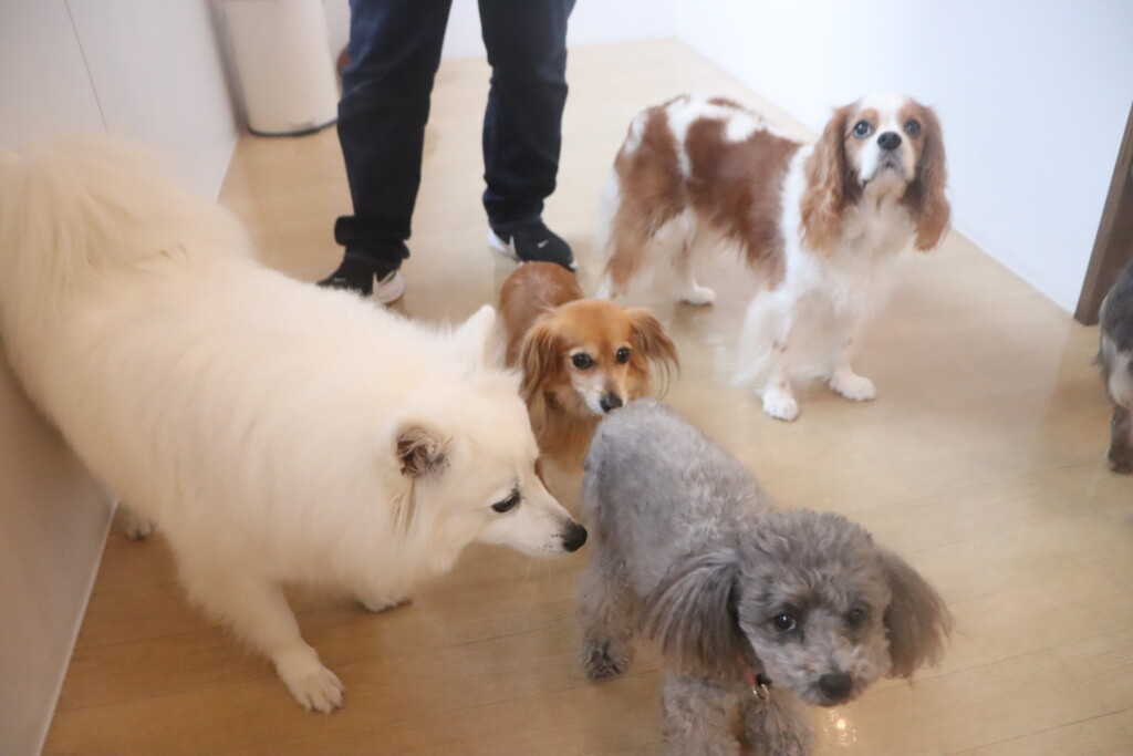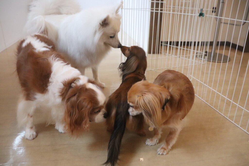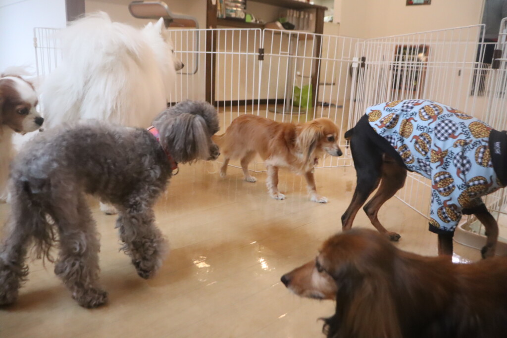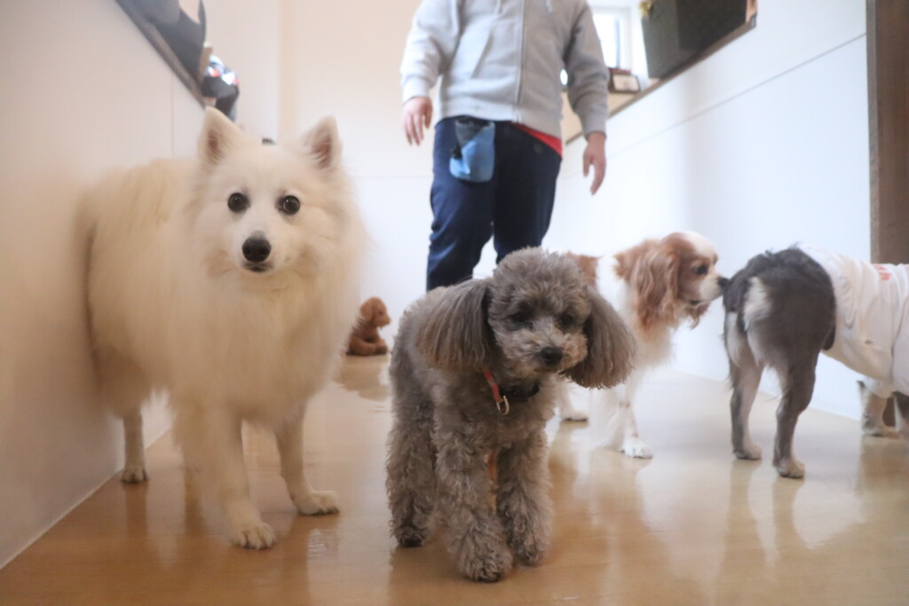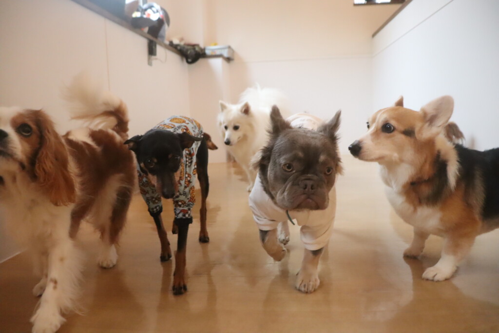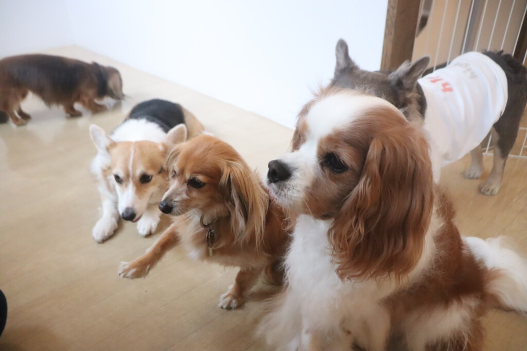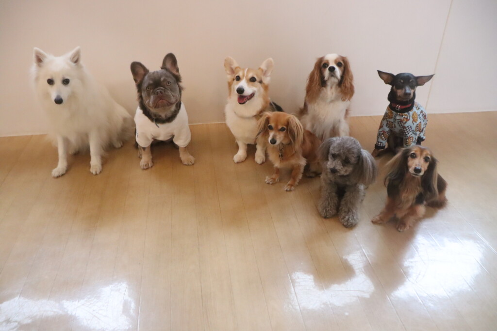 今日の保育園生は、日本スピッツのパブロンくん、ミニチュアピンシャーのルアくん、ウェルシュコーギーペンブロークのサクラちゃん、キャバリアキングチャールズスパニエルの茶々丸くん、チワワ×ミニチュアダックスフンドのらいくん、フレンチブルドッグのハイちゃん、トイプードルのアンジュちゃんです!