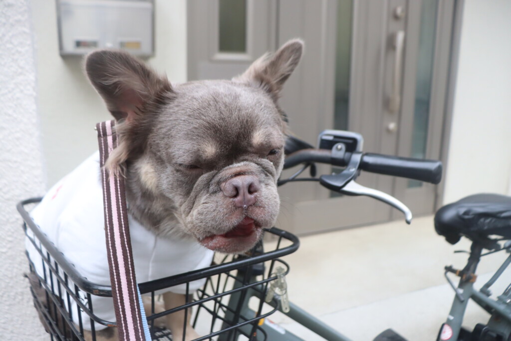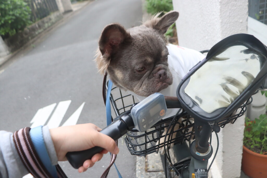 自転車の前かごに乗せてみると「なによこれー⤵⤵」とションボリハイちゃん(;´д`)ゞ
