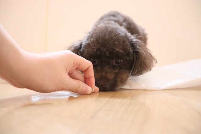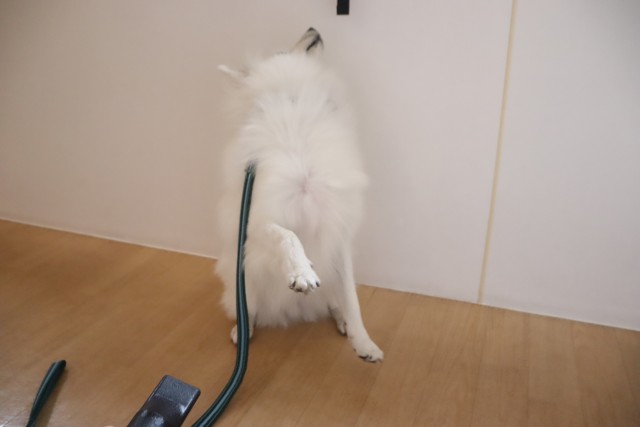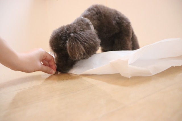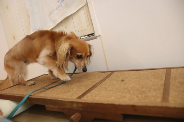 ビニール袋の上で伏せる練習をしているココちゃんですが…