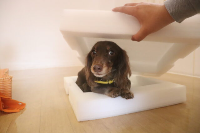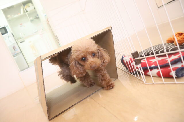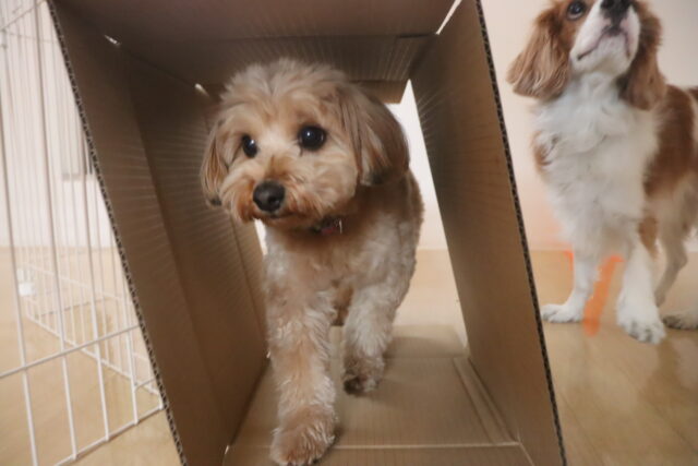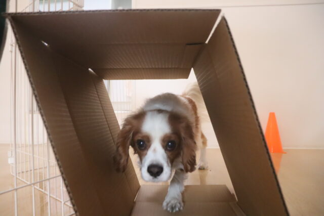 くうちゃんはダンボールや缶で物慣れを行いました!ダンボールをくぐったり、