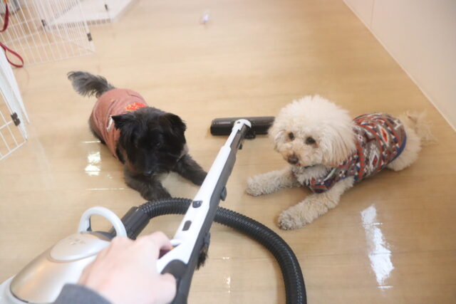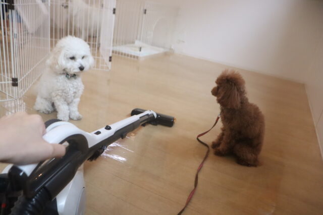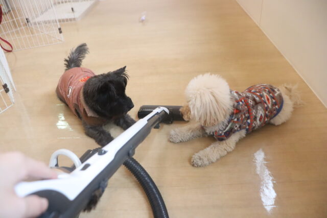 ノンちゃんと一緒に掃除機慣れも行いました!掃除機に興味津々の2頭👀