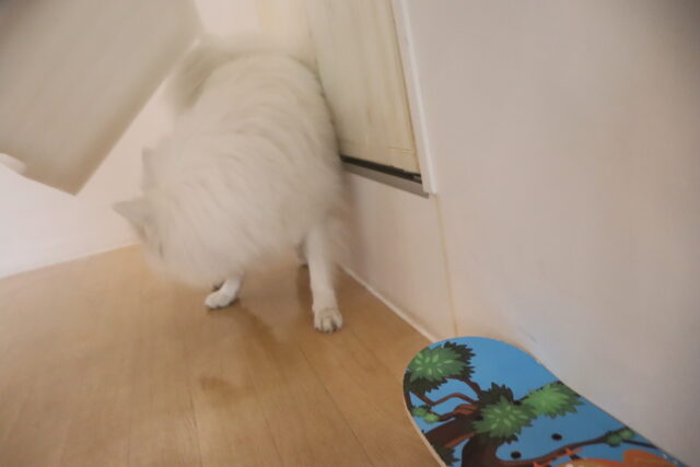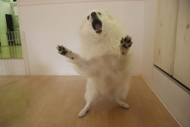 いざパブロンくんに投げてみると、必死すぎてフードを見失ってしまいました💦よく見て落ち着いてキャッチできるといいね👍必死な表情のパブロンくんが可愛らしかったです💕