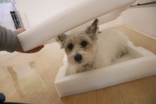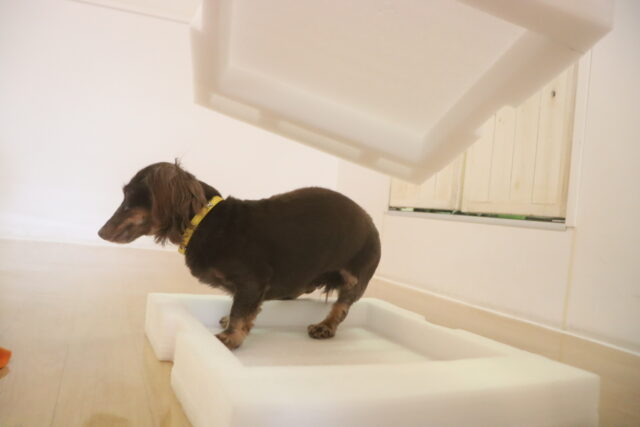 ソフィちゃん、ミーシャちゃん、パブロンくんは発泡スチロールで物慣れを行いました🌟「やんのか!?」と果敢に攻めるソフィちゃんと、