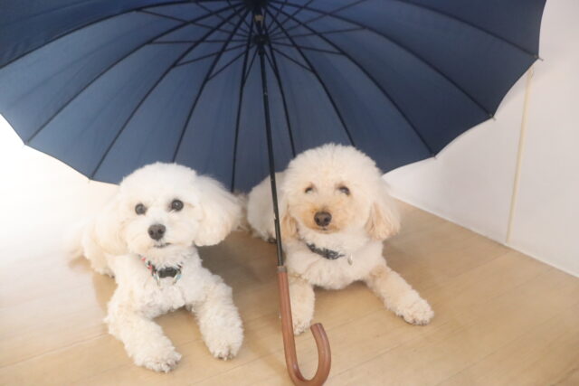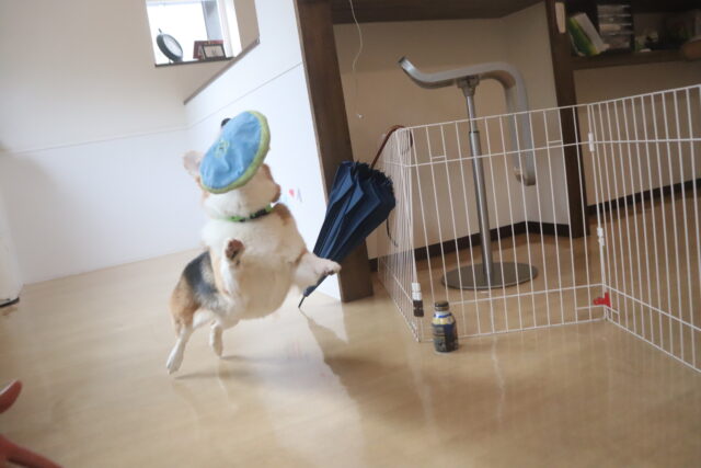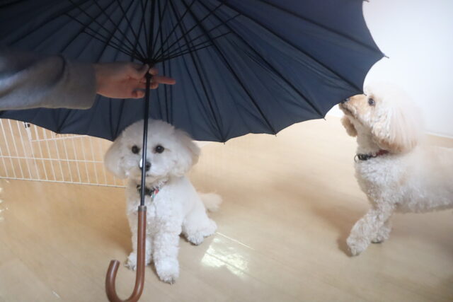 晴くんと一緒に傘慣れを行いました!傘に興味深々の様子…