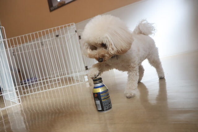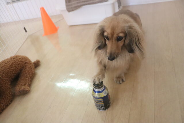 晴くんはコインの入った缶で物慣れをしました!揺らすと音の鳴る缶に警戒中の晴くん🤔