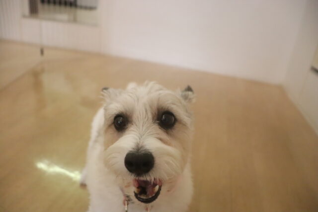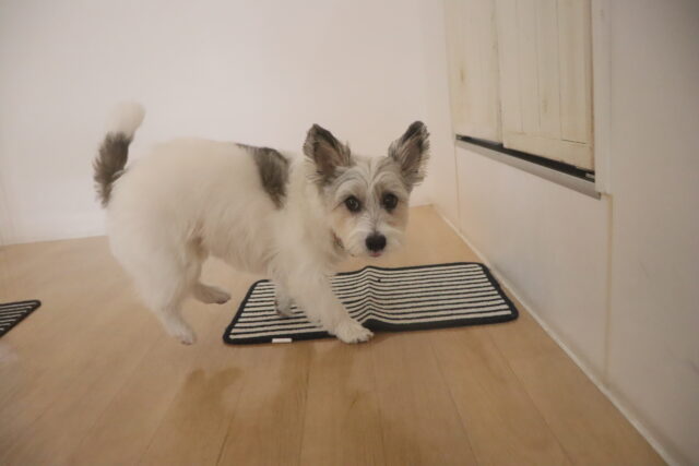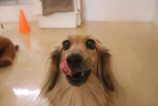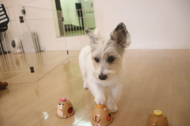 大量のフードに目を奪われるモモちゃんでしたが、スタッフの指示を聞いてしっかりと待つことが出来ましたよ💮