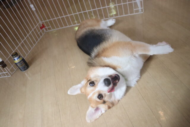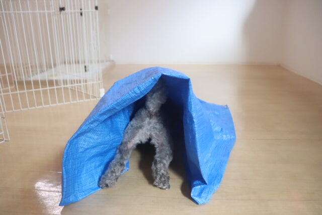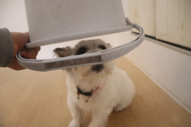 ソフィちゃんはバケツで物慣れを行いました!バケツが動き、ビックリするソフィちゃん💦