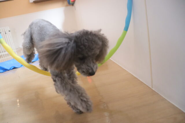 お見事!おもちゃを落とさずにフラフープを飛び越えることが出来ました👏着地の際の耳が可愛らしいですね💕