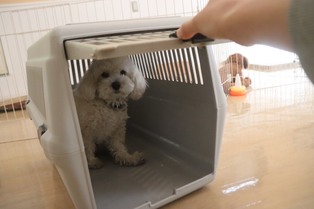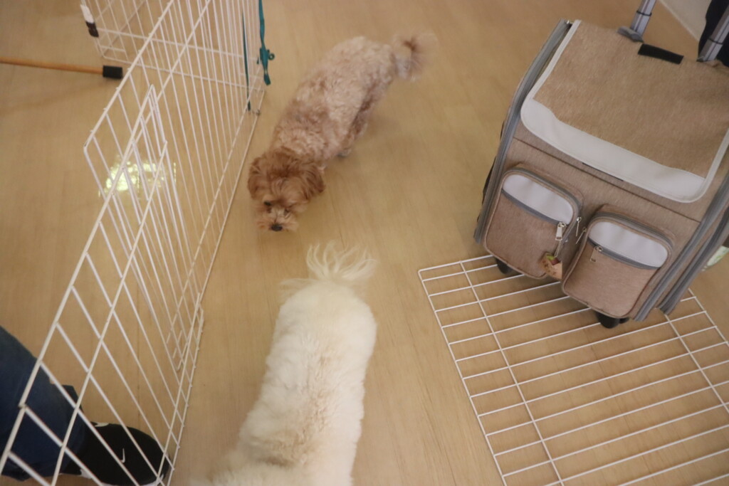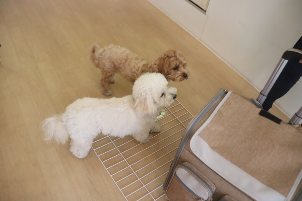 いつもとは違ったタイプのクレートではドアの部分を動かすと二頭とも少し緊張気味でした^^;