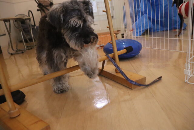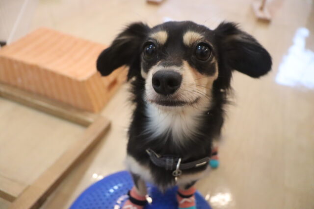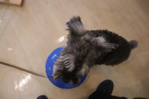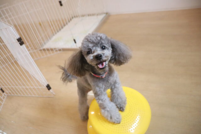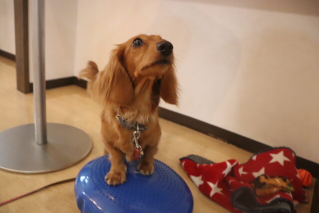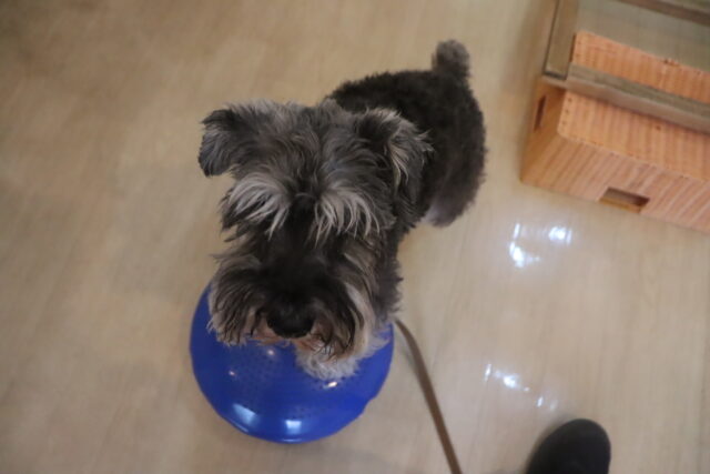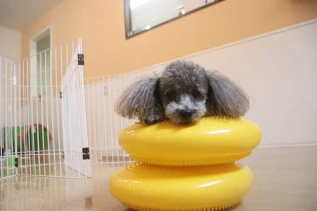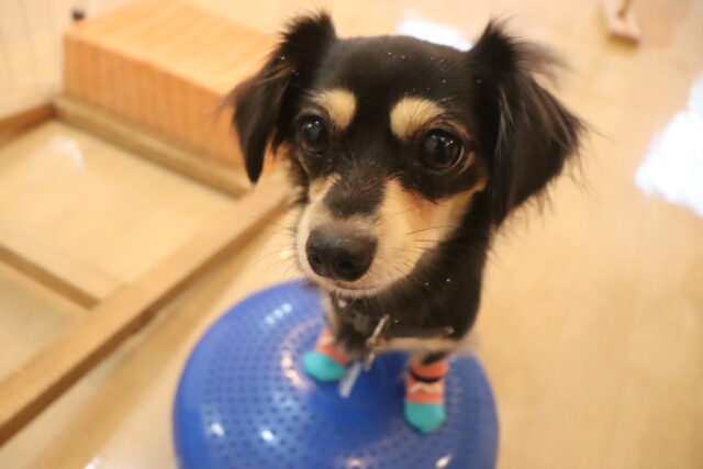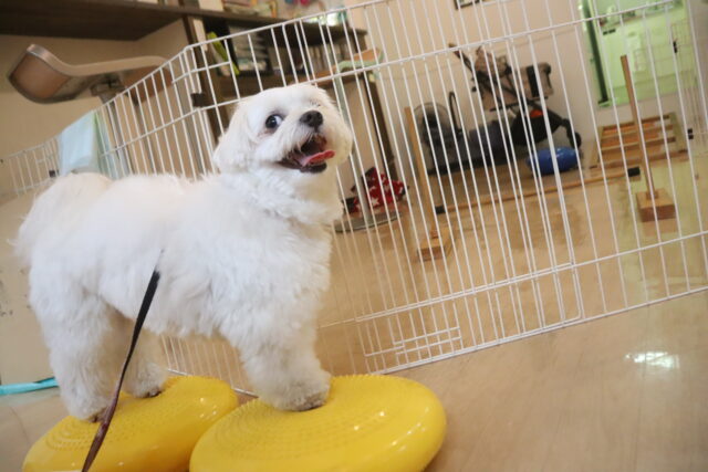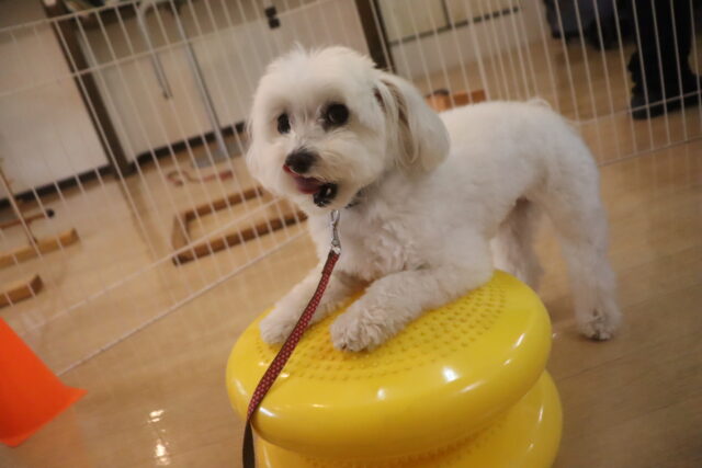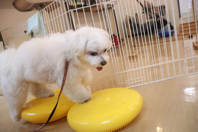 ゆずちゃんは重ねたバランスディスクにも挑戦しましたが、なかなか上手く乗れず可愛いポーズと表情で誤魔化していました🤭