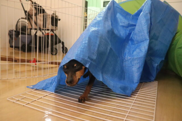 ルアくん、サンディちゃん、ゆずちゃんは雨でお散歩に行けない代わりに災害救助犬ごっこをして遊びました\(^o^)/