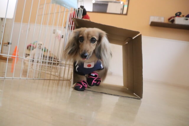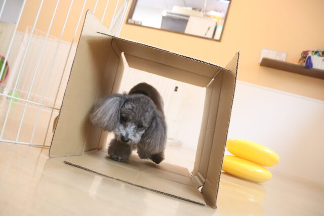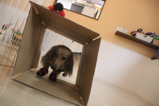 アンジュちゃん、ラテちゃんはダンボールくぐりもしています!