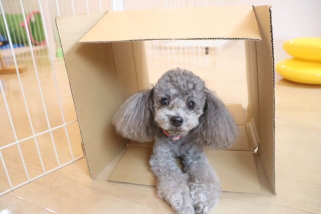 今にも崩れそうな頼りないダンボールに少し不安そうな2頭…(笑)