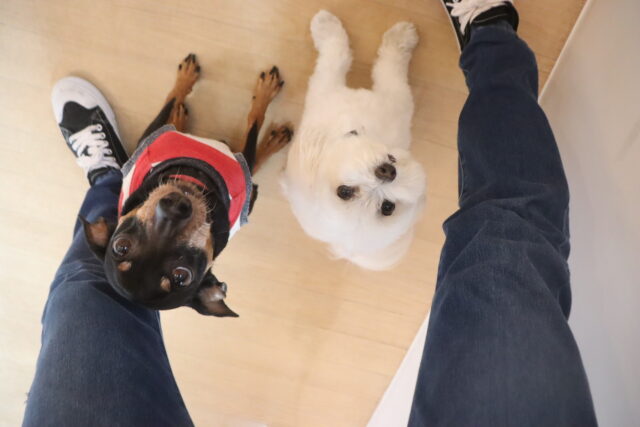 少しずつ慣れてはきているものの、2頭ともまだまだ怪訝そうな表情が多め…(笑)