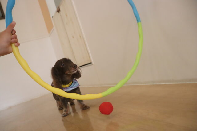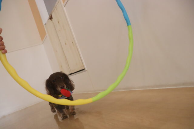 ミーシャちゃんはオモチャを咥えたままフラフープをくぐる練習にチャレンジ!