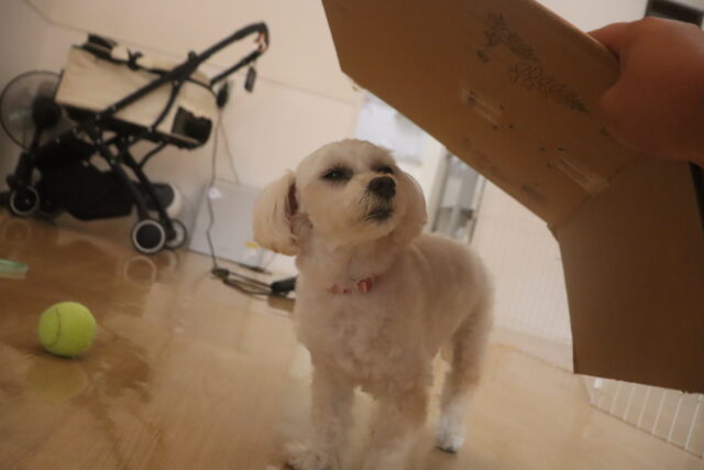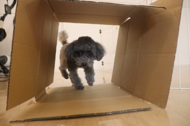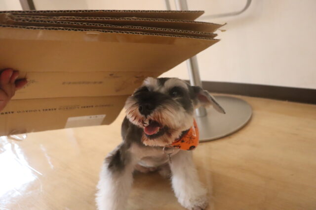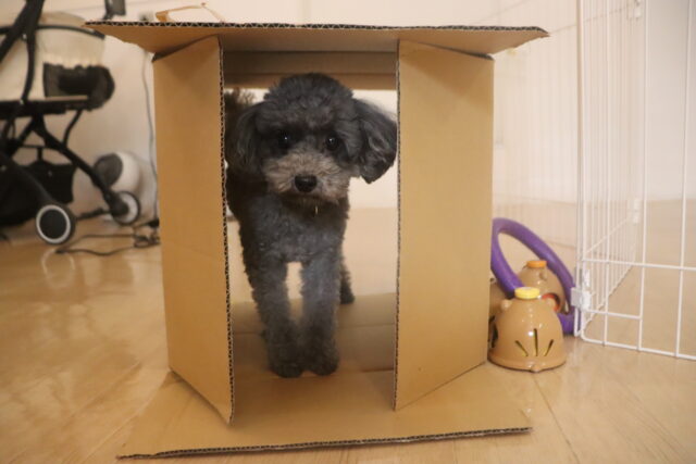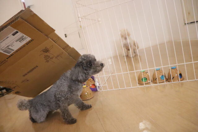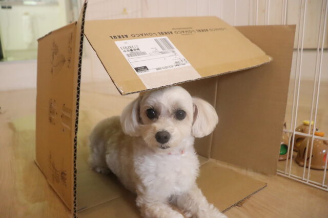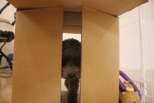 レイアちゃん、きなこちゃん、モモちゃん、ここみちゃんはダンボールで物慣れをしています!