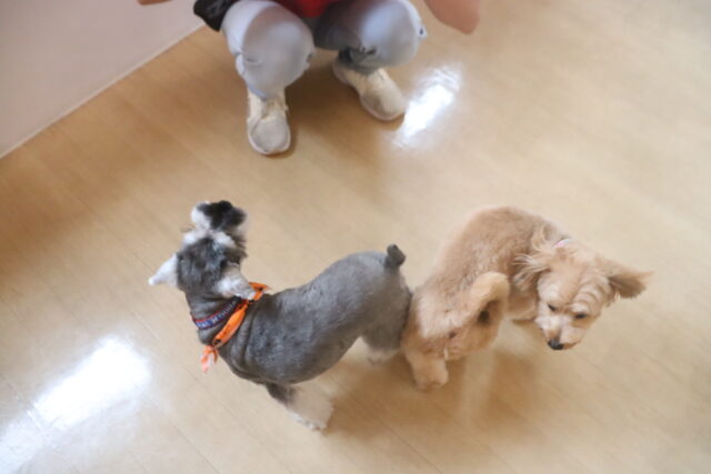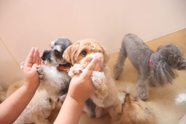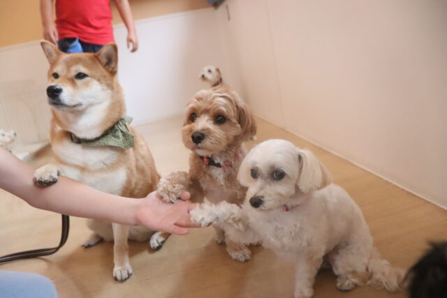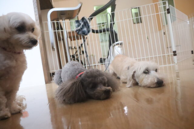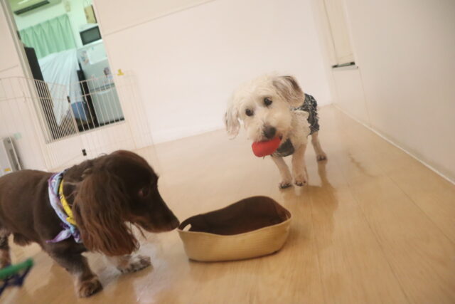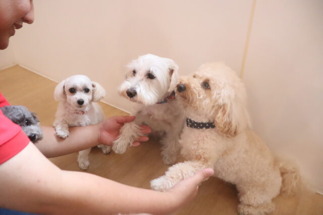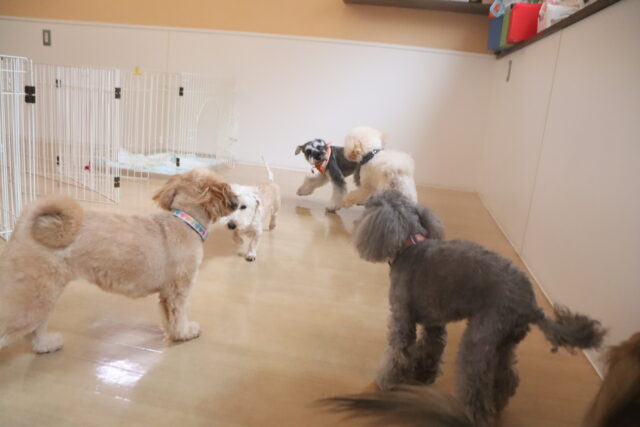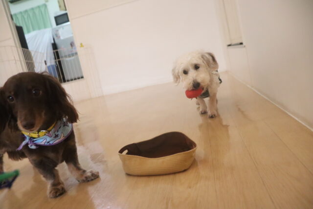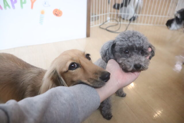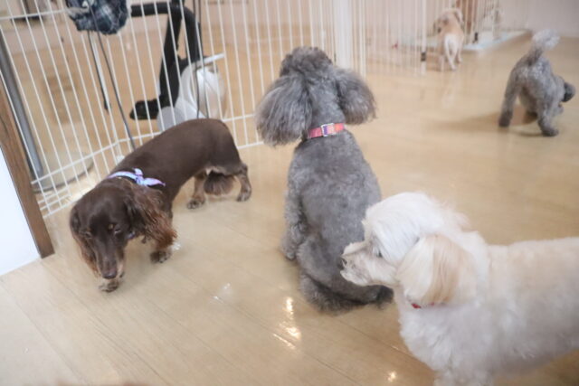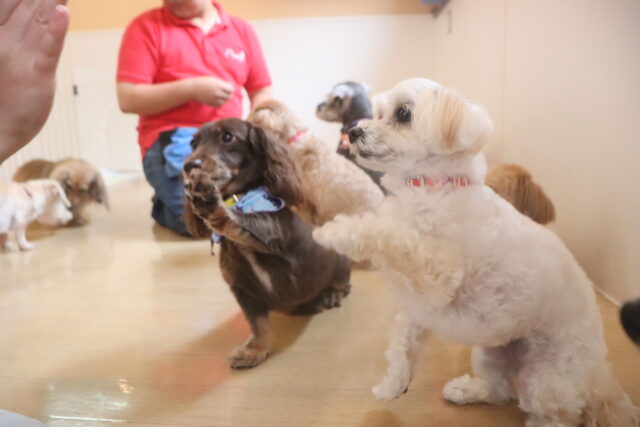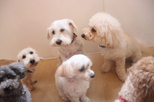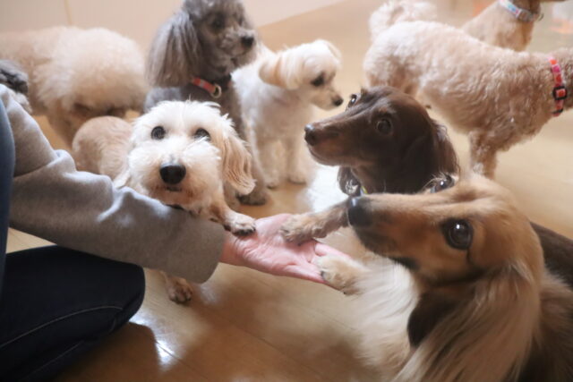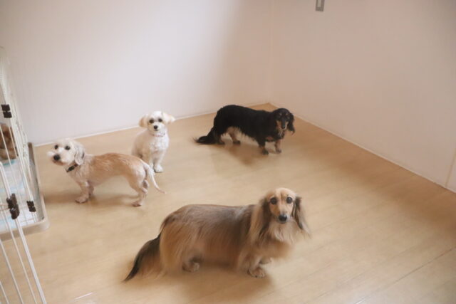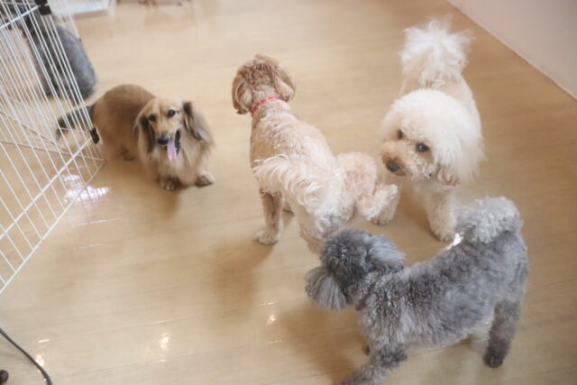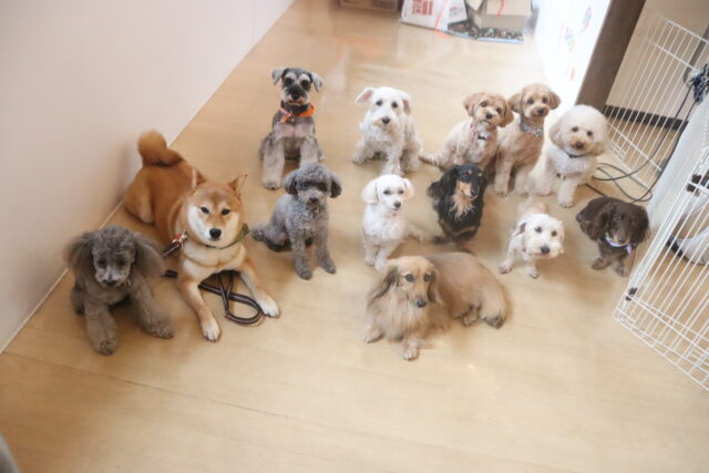 今日の保育園生は、マルチーズ×トイプードルのアリアちゃん・きなこちゃん・晴くん、ミニチュアダックスフンドのミーシャちゃん、ミニチュアシュナウザーのレイアちゃん・ソランちゃん、カニンヘンダックスフンドのラテちゃん・ここみちゃん、ワイヤーヘアードミニチュアダックスフンドの小梅ちゃん、トイプードルのモモちゃん・アンジュちゃん、ポメラニアン×トイプードルのエマちゃん、柴犬のポチちゃんです!
