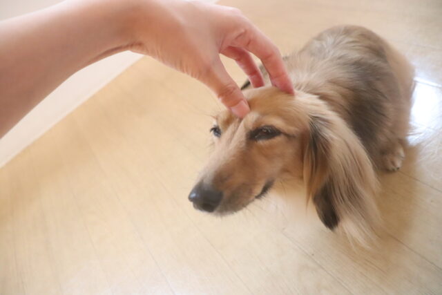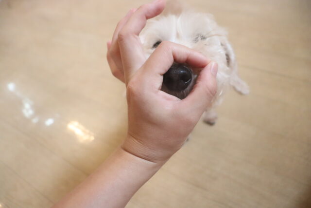 体を触られる練習ではついに無の境地にたどり着いた⁉ポチちゃん、おじさん座りも相まって面白い写真です(笑)