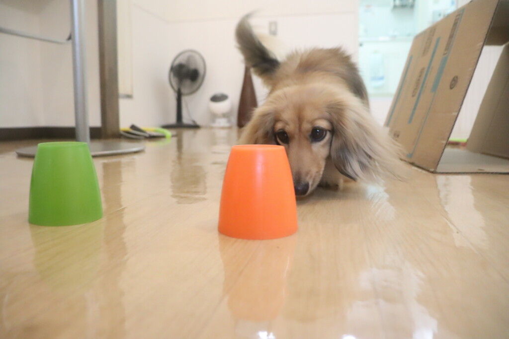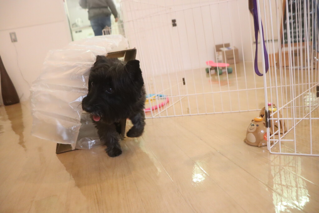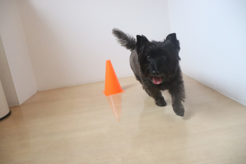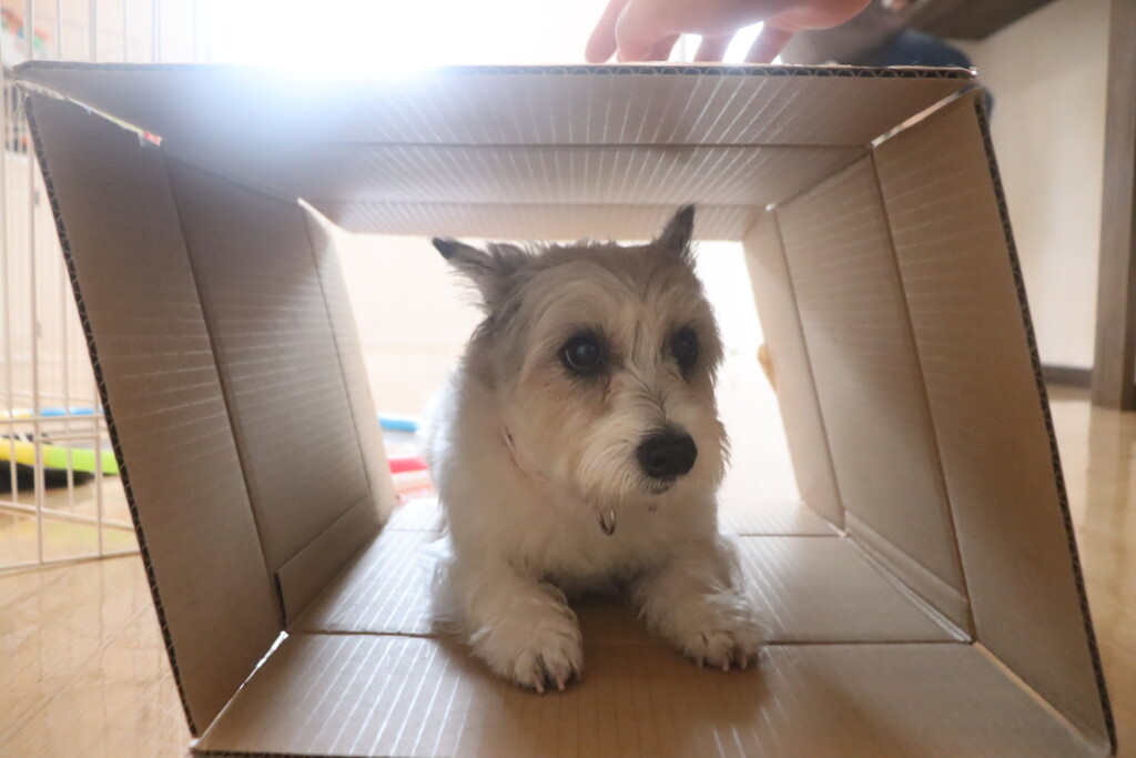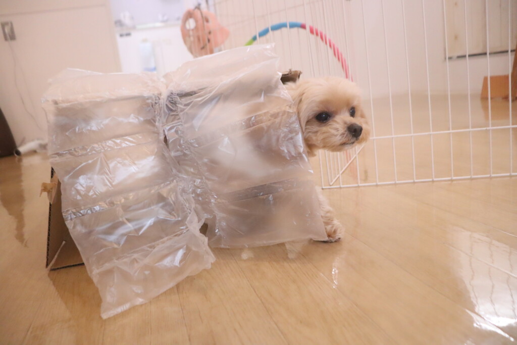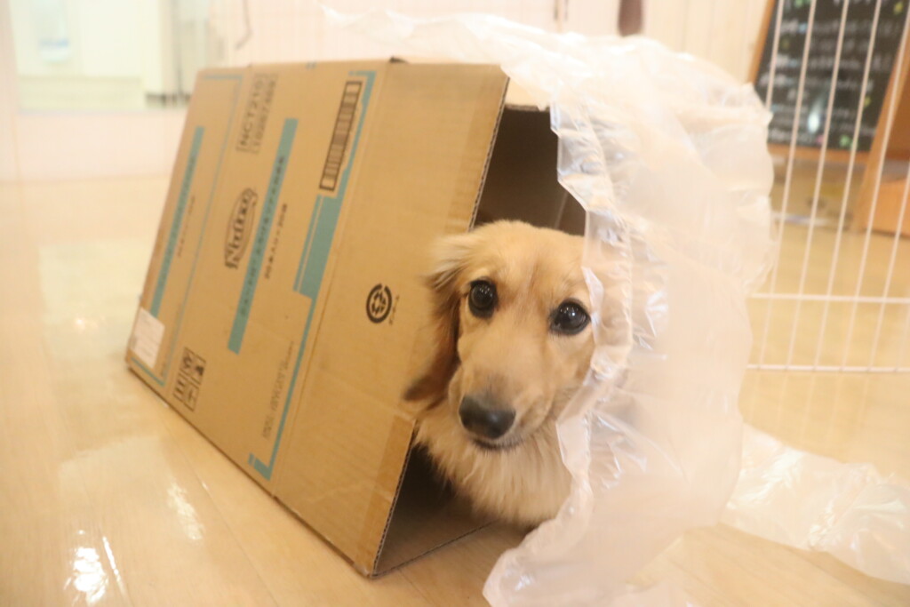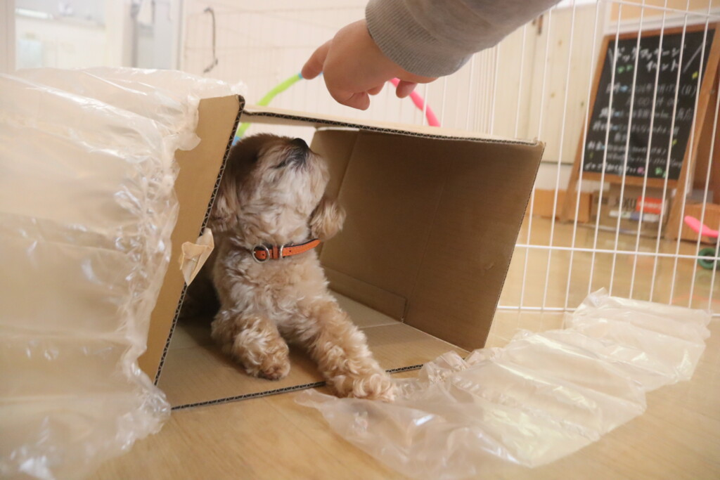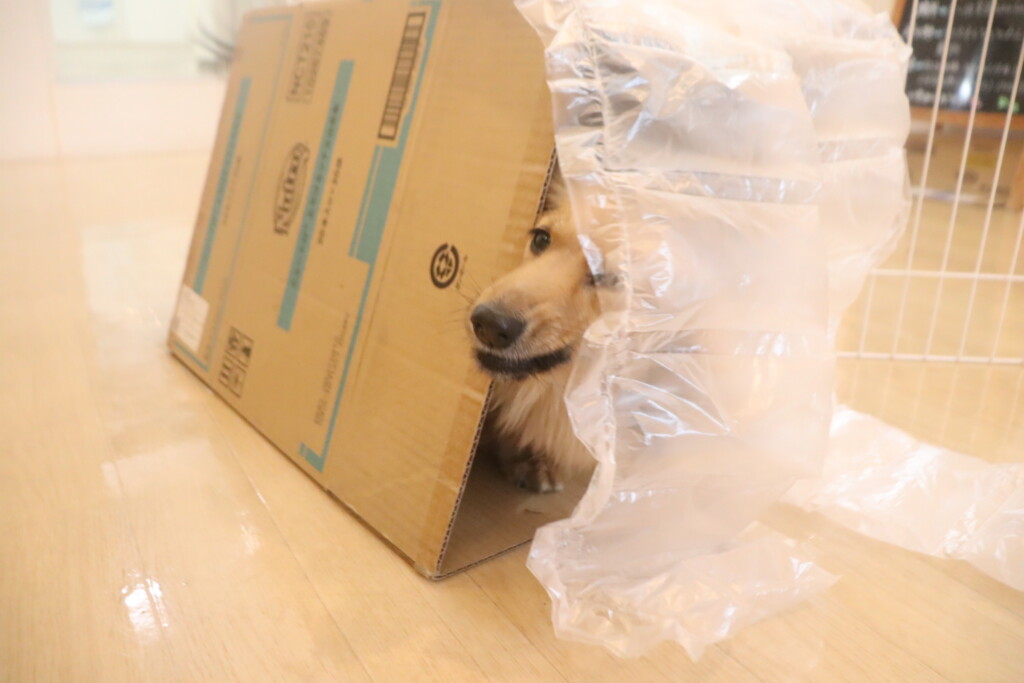 大好きな段ボールくぐりでもやはり音が鳴ると一気に緊張モードになってしまうので、得意と不得意を織り交ぜながらより慣れてもらえるよう練習を進めていきます!