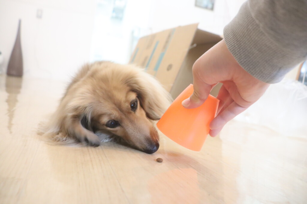 スタッフがわざと顔の前をヒラヒラさせると見事につられてしまったハイちゃん(笑)