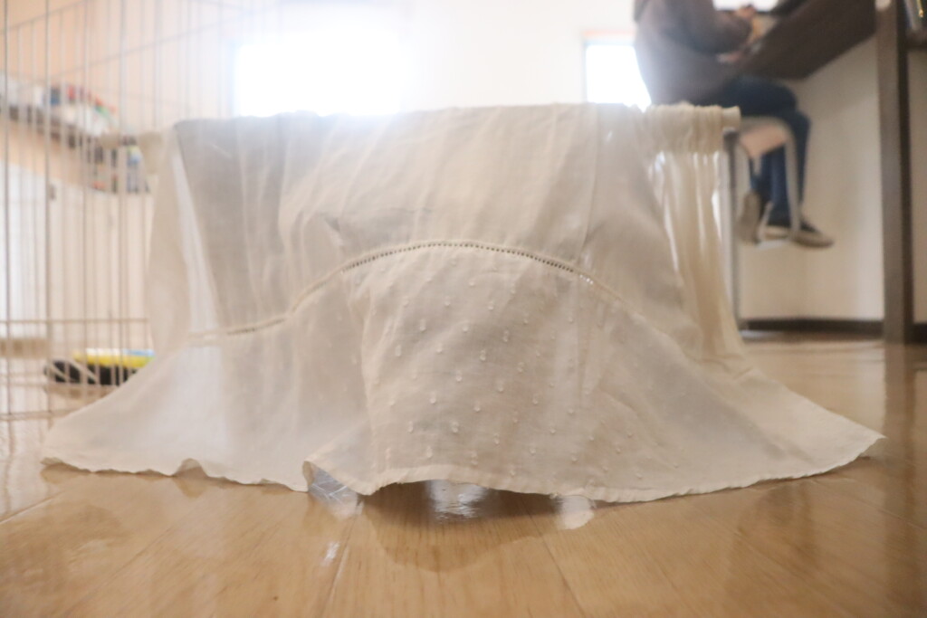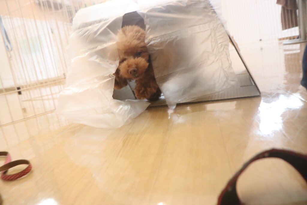 くうちゃん、うるくん、ノンちゃん、ラテちゃんはダンボールに付けたビニールカーテンをくぐる物慣れをしましたよ!