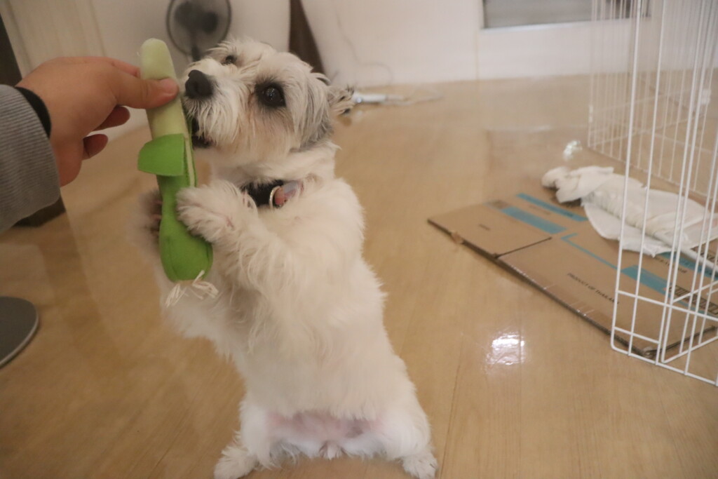 ハグの練習はネギのオモチャを使うとお腹が空いてしまったのかついついパクっとお口を開けてしまうソフィちゃんでした😋