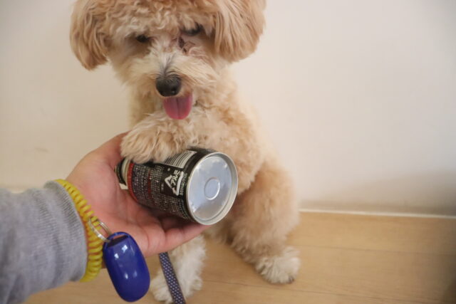 音には少し警戒気味でしたが最後は缶に触ることが出来ましたよ👏いろいろな物に慣れていけるように練習していこうね!