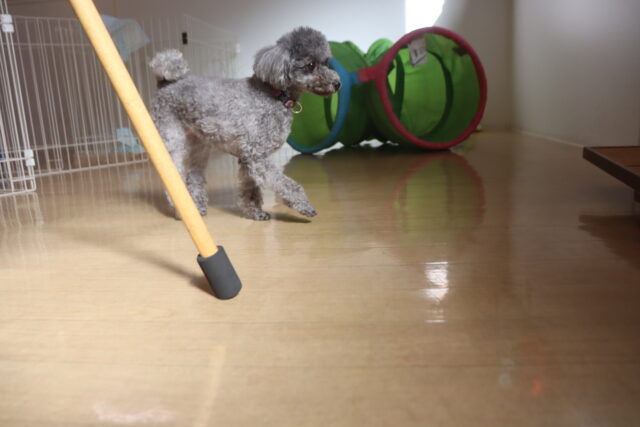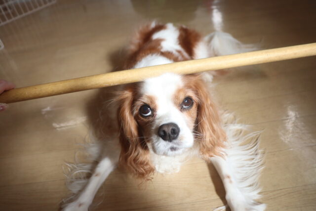 コロコロと転がってくる棒にビックリなモモちゃん💦