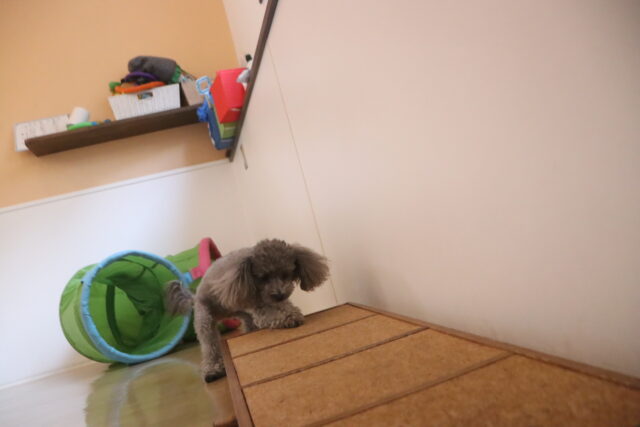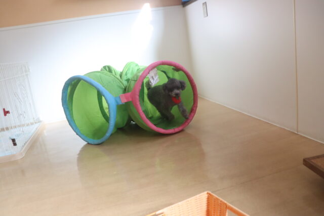 茶々丸くんと一緒にトリック練習を行いました♪茶々丸くんの周りをモモちゃんが回るトリックをしようとしましたが、目の前にあったトンネルにまっしぐらのモモちゃん😅