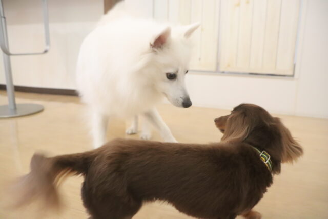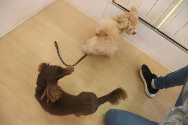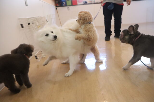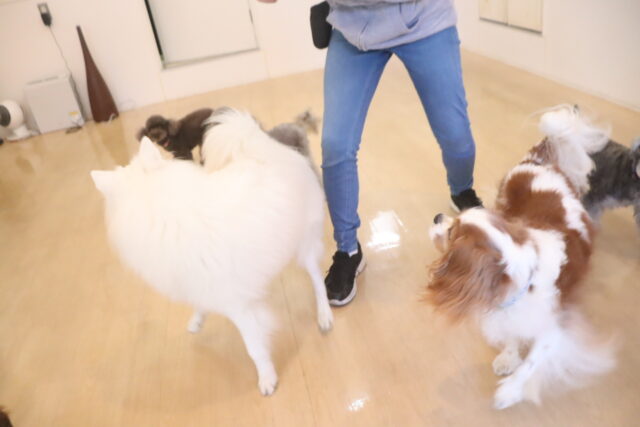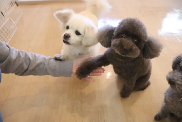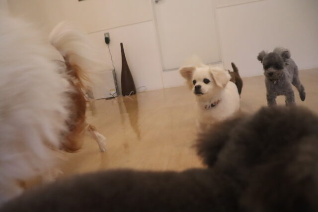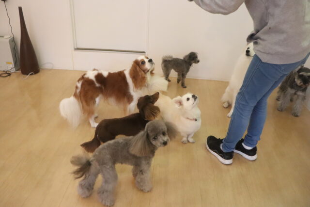 今日の保育園生は、トイプードルのアンジュちゃんとモモちゃんとココちゃん、ミニチュアシュナウザーのレイアちゃん、日本スピッツのパブロンくん、キャバリアキングチャールズスパニエルの茶々丸くん、ペキニーズ×ダックスフンドの雪ちゃん、マルチーズ×トイプードルのアンディくん、フレンチブルドッグのハイちゃん、カニンヘンダックスフンドのココくんです!