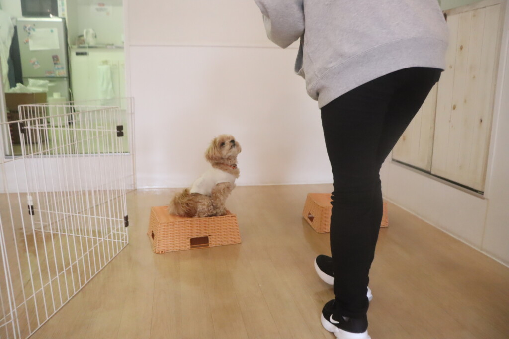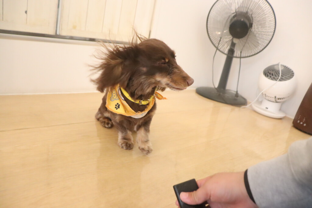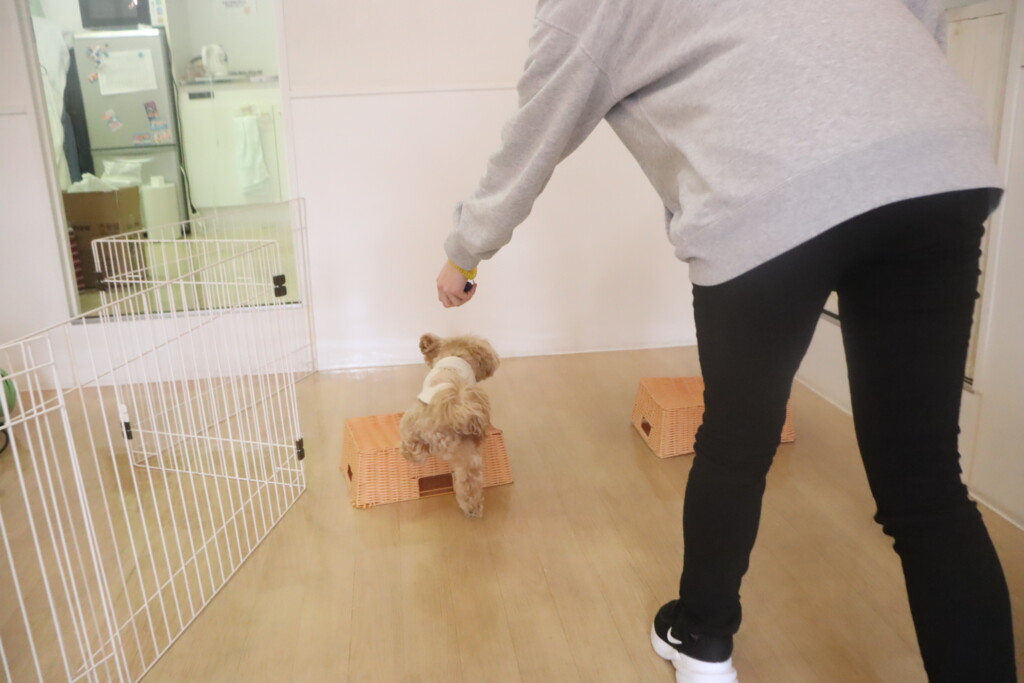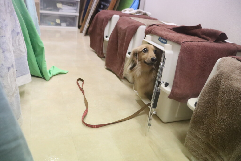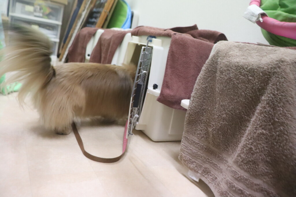 スタッフの「ハウス」の声掛けをしっかりと聞き、遠隔でもスムーズにクレートの中へ入ることが出来ています🎵