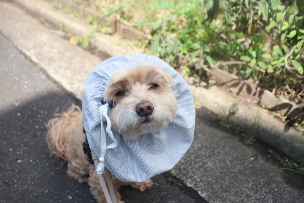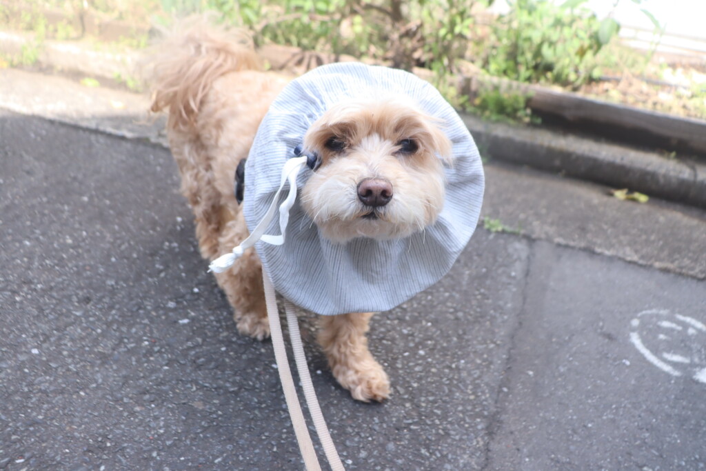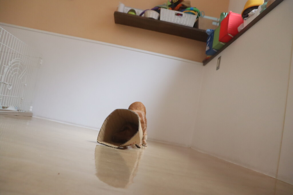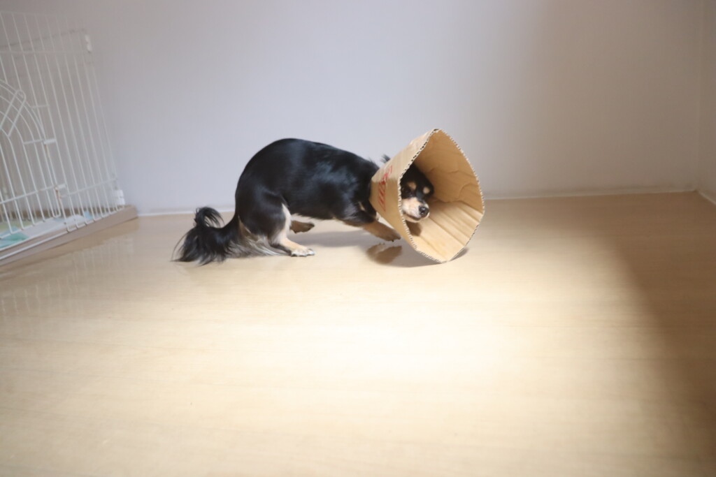 みるもちゃんとこころちゃんはダンボールで作成したエリザベスカラーを着用する練習をしました!